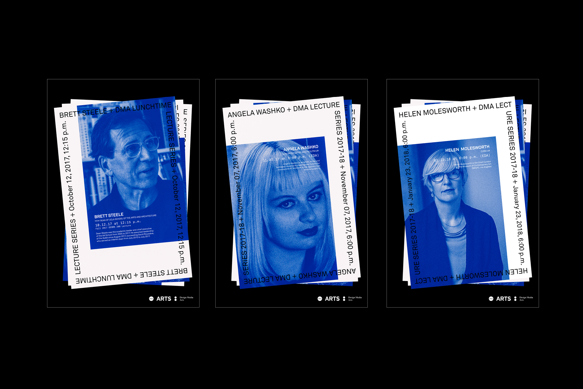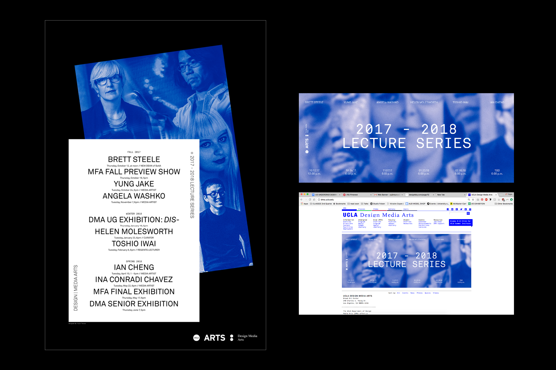Brand identity for the UCLA DMA Lecture Series 2017-18 and pop-up lectures. I was inspired by the original websites’ use of IK Blue and incorporated its tonal range in the portrait photographs. The poster produces a sense of physicality and dimension with the animated repetition of graphic layered element.